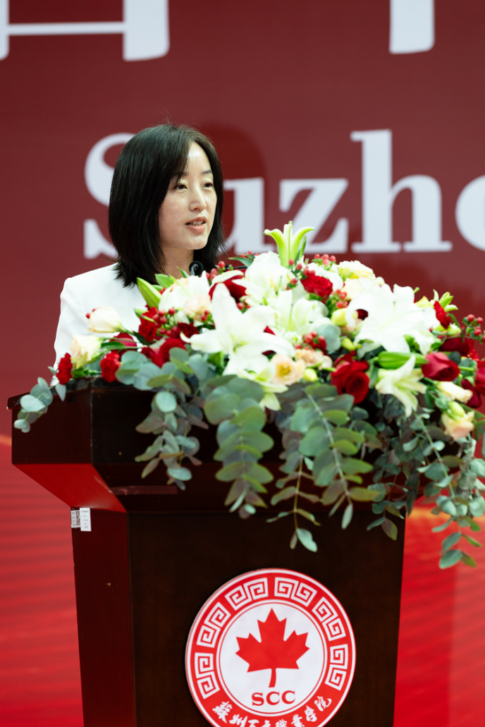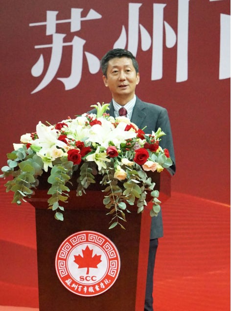 苏州独墅湖科教创新区党工委委员、管委会副主任陈淼首先上台致辞,她代表独墅湖科教创新区管委会向新生们的到来表示热烈的欢迎,她介绍了苏州工业园区在科技创新和产业创新方面取得的成就,以及独墅湖科教创新区作为全国首个高等教育国际化示范区在做好“教育”这篇文章上的努力和成绩。她指出,开云kaiyun体育作为经江苏省批准,教育部备案的全国第一所独立法人的中外合作办学高职院校,自成立以来聚力“园-企-校”发展共同体,坚持推进“442”发展战略,面向苏州大市的“1030”产业体系,也同时面向苏州工业园区的“2+4+1”产业方向,深化产教融合,为地方发展输送了一大批的高技能人才。她希望同学们利用好开云kaiyun体育的优质教育资源和苏州工业园区的产业化平台,练就真才实学,习得扎实本领,成长为敢为人先,勇攀高峰的高技能型人才。
