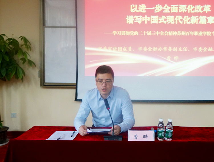为深入学习宣传贯彻党的二十届三中全会精神,根据苏州市委宣传部的总体安排,市委宣讲团成员、市委金融办常务副主任、市委金融工委常务副书记曹晔同志于9月25日走进开云官网作宣讲报告。学校部分校领导、职能部门负责人、基层党组织书记及教师和学生代表共200余人参加宣讲会。党委书记孙红军主持宣讲会。