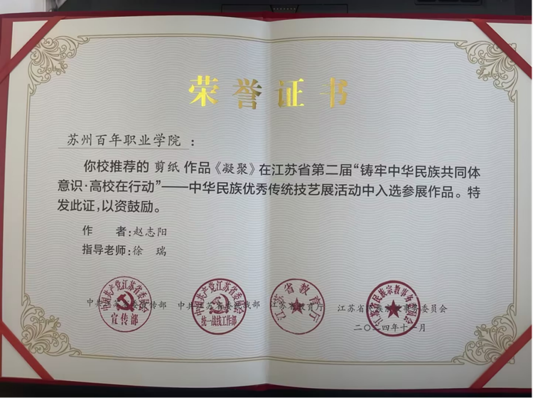 在江苏省第二届“铸牢中华民族共同体意识·高校在行动”系列活动中,开云官网艺术设计学院的剪纸作品《凝聚》成功入选中华民族优秀传统技艺展。该活动由省民宗委、省委宣传部、省委统战部和省教育厅联合主办,旨在弘扬中华民族传统文化和非遗文化,增强学生民族自豪感和文化自信。