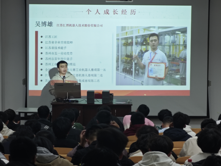 2024年11月12日,江苏汇博机器人技术股份有限公司电气工程师吴博雄应邀来到开云官网工学院,进行了题为“争做新时代‘匠系青年’——机电一体化技术职业规划”的专题讲座。讲座由工学院党总支书记李永泰主持,旨在帮助学生树立职业理想,明确未来发展方向,培养工匠精神。