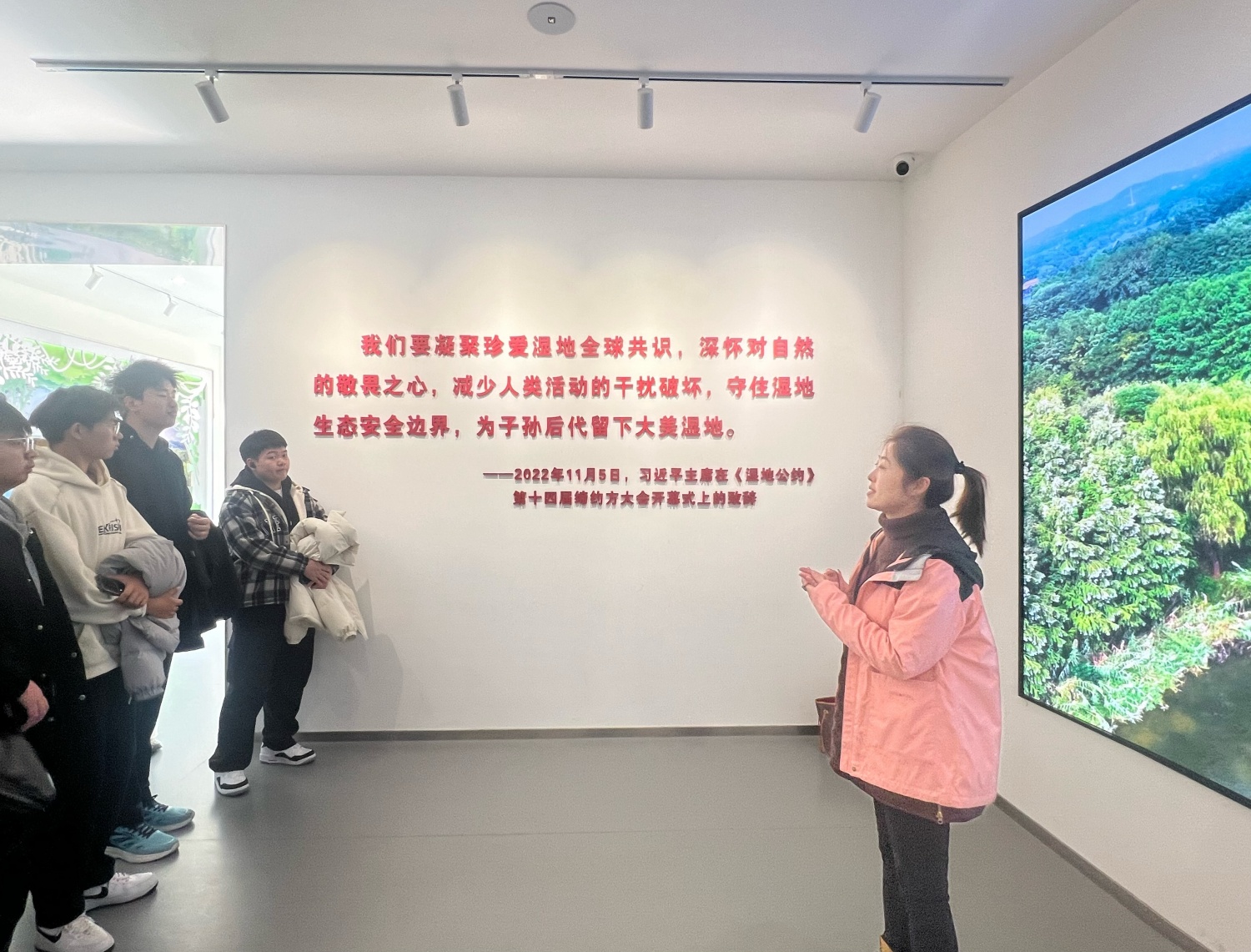 在带队老师的组织和指导下,同学们首先一起走近湿地科普馆,学习了习近平总书记在《湿地公约》第十四届缔约方大会开幕式上所发表的《珍爱湿地,守护未来,推进湿地保护全球行动》致辞:“我们要凝聚珍爱湿地全球共识,深怀对自然的敬畏之心,减少人类活动的干扰破坏,守住湿地生态安全边界,为子孙后代留下大美湿地。”