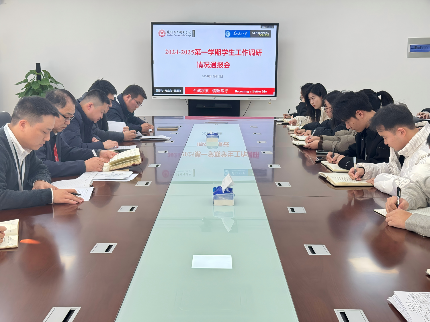 会上,各调研组组长依次通报调研情况,详细介绍了各二级学院在爱国爱校教育、班会及主题班会教育、宿舍文化建设及2024届毕业生与2025届顶岗实习等工作中开展的情况及成效,并指出当前学生工作中数据与信息管理有待完善,特别是学生基础信息、主题班会记录、谈心谈话记录等关键领域,需要建立更加细致、全面且准确的台账管理制度,确保数据的完整性、可追溯性和时效性,提升学生管理工作的精准性和效率。