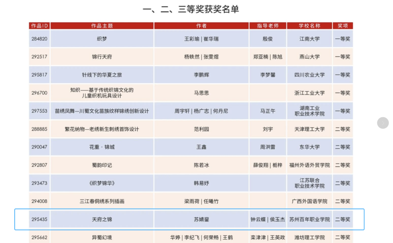 开云官网苏婧鋆同学的作品《天府之锦》在未来工匠学院钟云蝶、侯玉杰老师指导下,在第九届“米兰设计周-中国高校设计学科师生优秀作品展”「非遗数字文创—锦绣设计大赛」中与众多院校及专业人士同台竞技,凭借出色的创意和扎实的技能荣获全国二等奖的好成绩(排名全国前20名)。获奖名单如下: