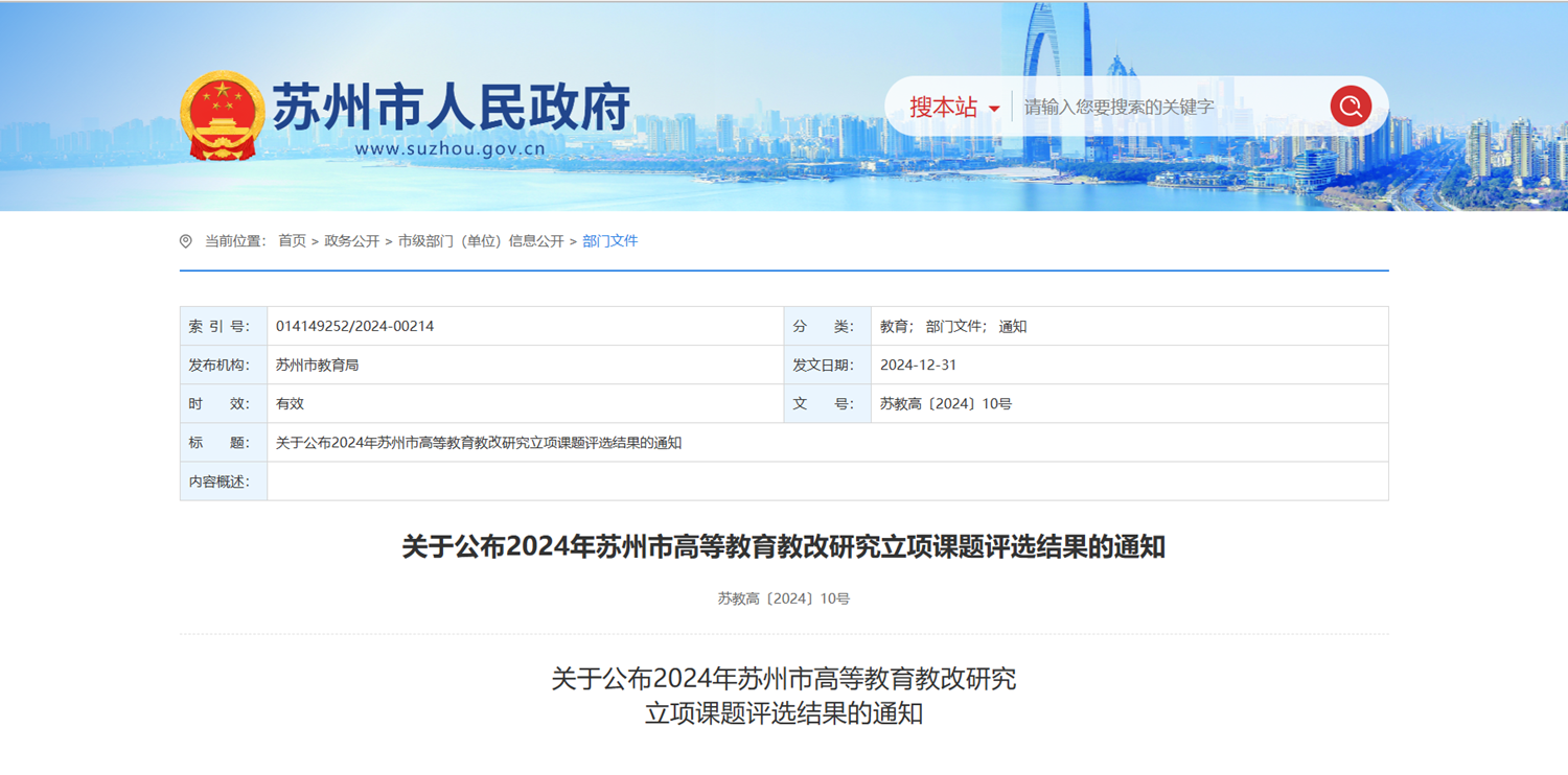 根据《关于开展2024年苏州市高等教育教改研究课题立项建设申报工作的通知》(苏教高〔2024〕7号)精神,经学校申报、专家评审、结果公示,共评选2024年苏州市高等教育教改研究立项课题25项,现予以公布。其中开云官网李世明、鲁伟作为主持人联袂领衔申报的课题《大学生创新创业教育、创业能力培养的研究》获得正式立项,项目编号为2024SZGJ24。预祝课题组取得丰硕研究成果,按期结项。
