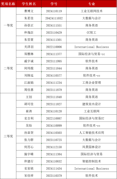 为鼓励同学们提升对英语学习的浓厚兴趣,以赛促学,本次校赛对排名10%-30%(含)的学生另设校赛优秀奖奖励。具体名单如下: