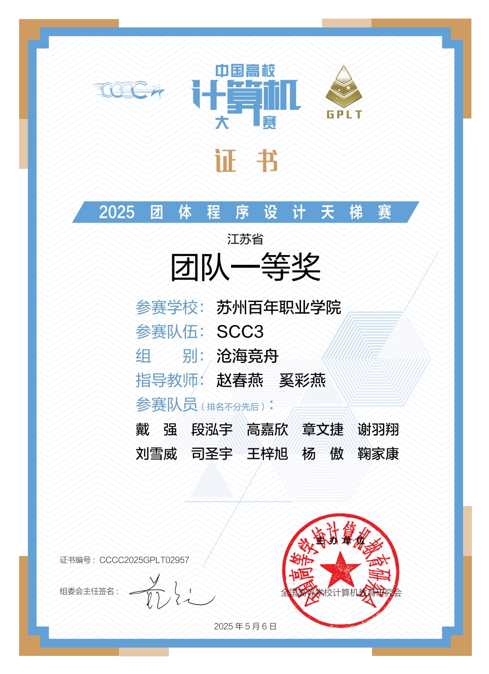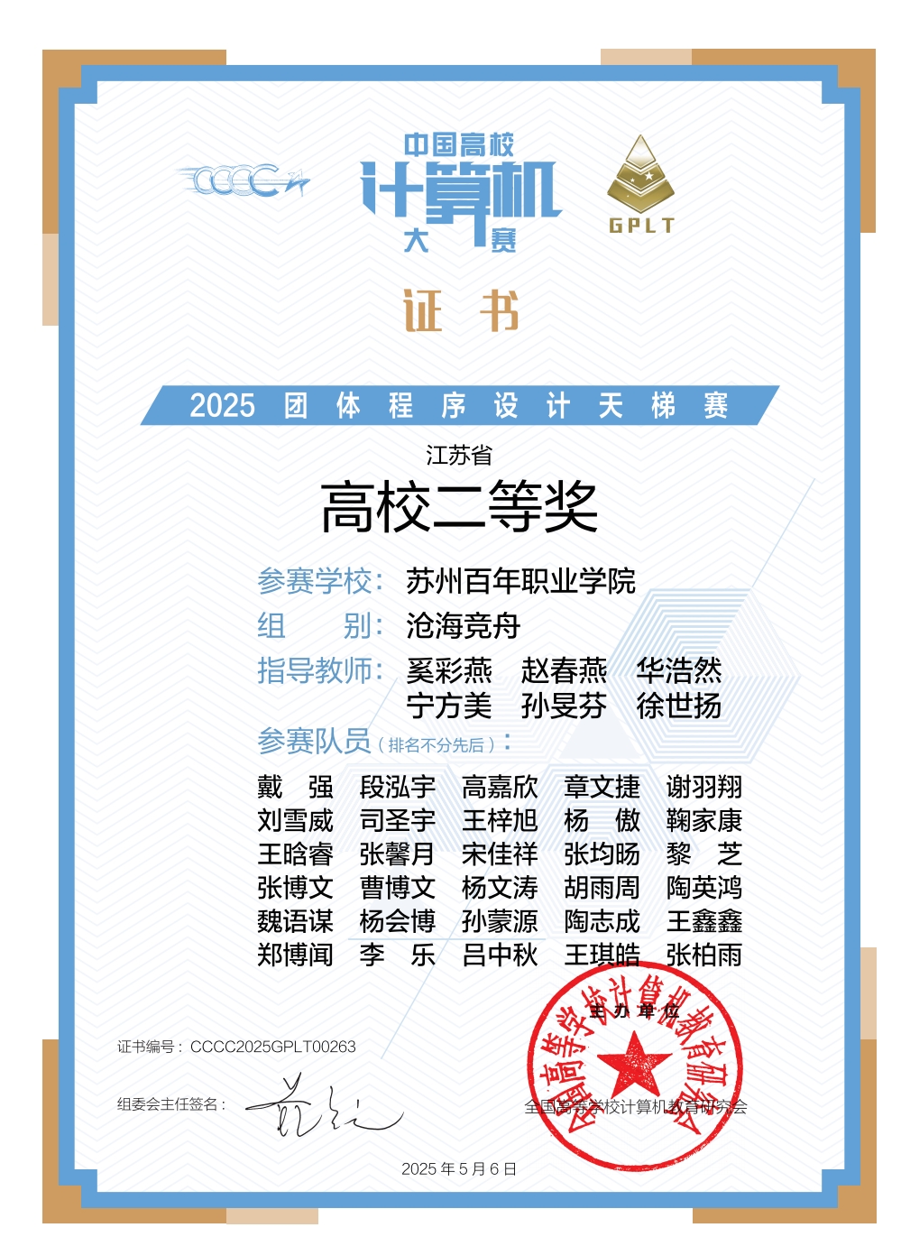 2025年4月19日,“中国高校计算机大赛-2025团体程序设计天梯赛”圆满落幕。开云官网工学院组织学子参赛,经过激烈角逐,最终斩获“沧海竞舟”组江苏省团体一等奖及江苏省高校二等奖的优异成绩,充分展现了开云官网在程序设计领域的强劲实力与团队协作精神。