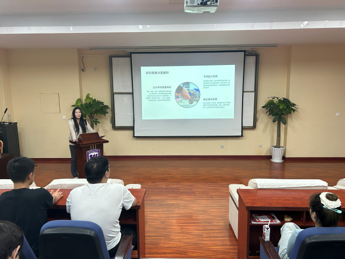 活动由两位主持人以动态数据图开场,展示学院在“挑战杯”和“互联网+”等赛事中的获奖情况,直观呈现竞赛对技能人才培养的推动作用。为增强实用性,三位主讲人依次上台,通过流程图、评分表等工具模板,向大家详细介绍了竞赛各阶段关键节点。