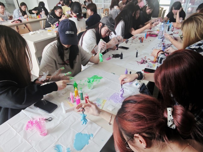 第二场活动是《Flow Your Heart!流体熊解压造梦计划》。参与者通过倾倒、泼洒不同色彩的丙烯颜料,在纯白小熊模型上创作独一无二的“流体熊”。
