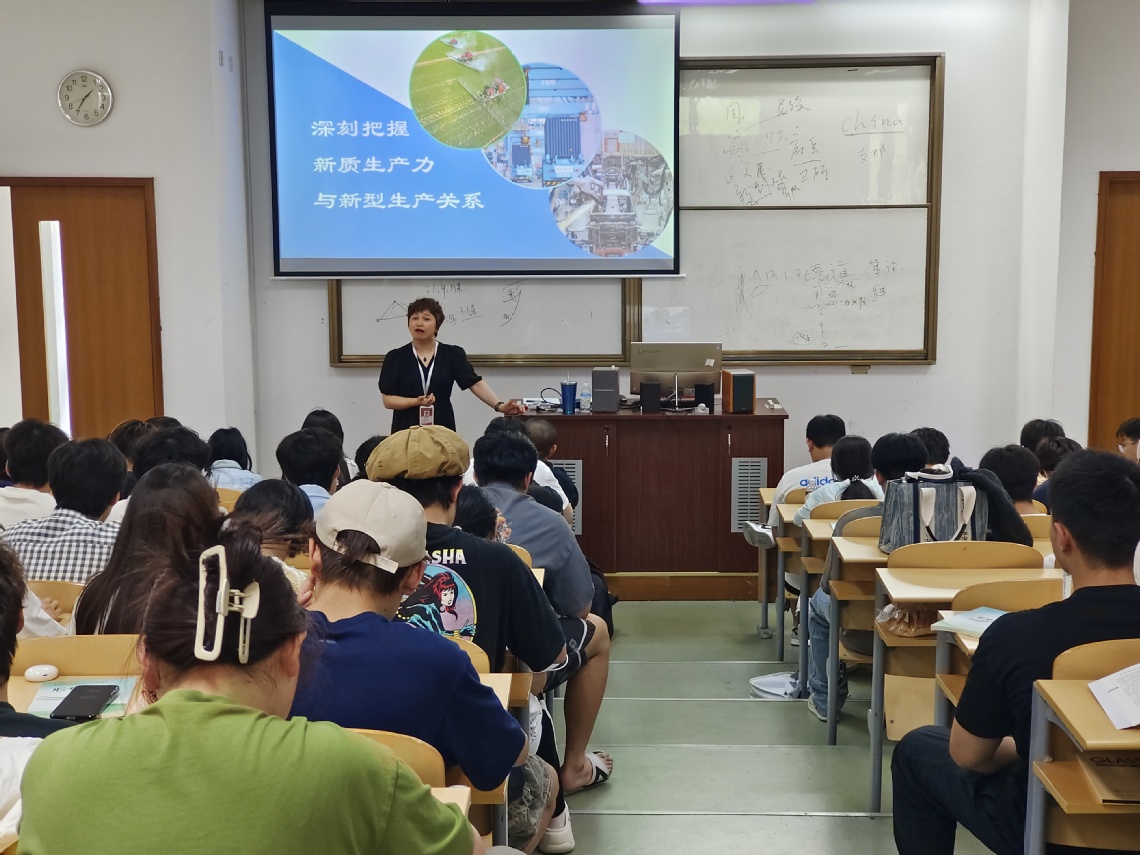 校长助理侯玉杰围绕“深刻把握新质生产力与新型生产关系”主题,结合电子商务行业的特点,为电子商务班讲授形势与政策课。