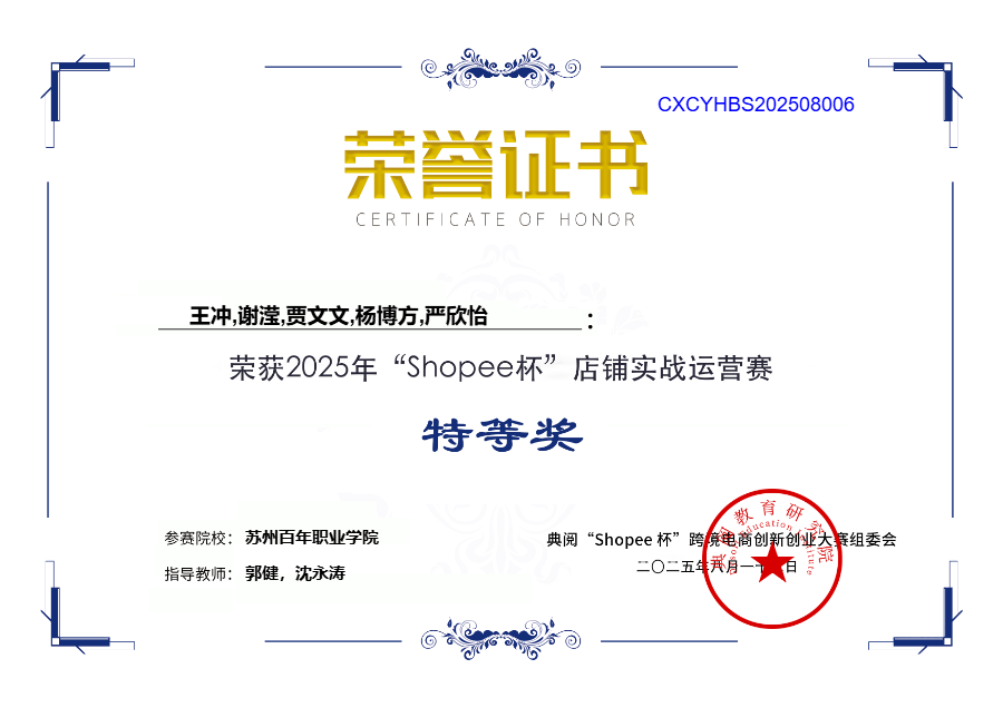 2025“Shopee杯”跨境电商创新创业大赛全国总决赛落幕。开云官网数字经济与管理学院表现亮眼,三支代表队均成功入围全国总决赛,最终斩获多项重量级奖项:“苏州百年职业二队”以全国第六名的实战业绩荣获“店铺实战运营”赛道特等奖;“苏州百年职业一队”在“全流程模拟运营及数据分析”赛道中斩获三等奖;同时,两队亦在“全流程模拟运营及数据分析”赛道中收获优秀奖。