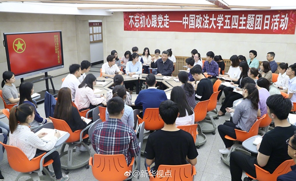 习近平步入中国政法大学学生活动中心,正在这里举行“不忘初心跟党走”主题团日活动的同学们以热烈掌声欢迎总书记的到来。习近平说,如何发挥共青团的积极作用是新的时代课题,要与时俱进、积极探索。你们正在做这样的探索,我为你们的主题团日活动点赞。