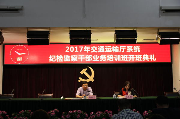 2017年5月24日,2017年交通运输厅系统纪检监察干部业务培训班在我院开班。开班典礼由驻交通运输厅纪检组副处级检查员杨冬蕾主持,交通运输厅纪委副书记、监察室主任孟新华出席开班典礼并作讲话。