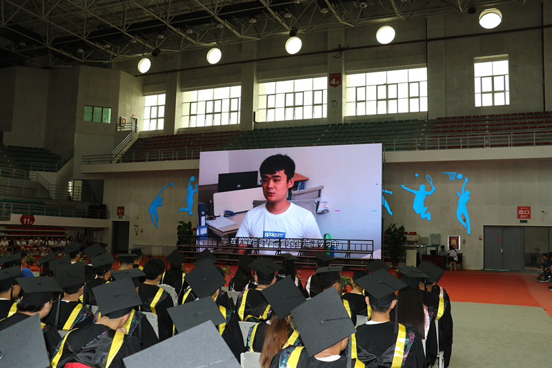 典礼中,还播放了毕业生代表在就业单位的工作生活剪影、回顾了大学三年的青春岁月及他们对在校学弟学妹们的希望与祝福;学院在校生代表用诗朗诵为2018届毕业生送上祝福,动情的话语、真挚的情感将毕业典礼的气氛推向了高潮。