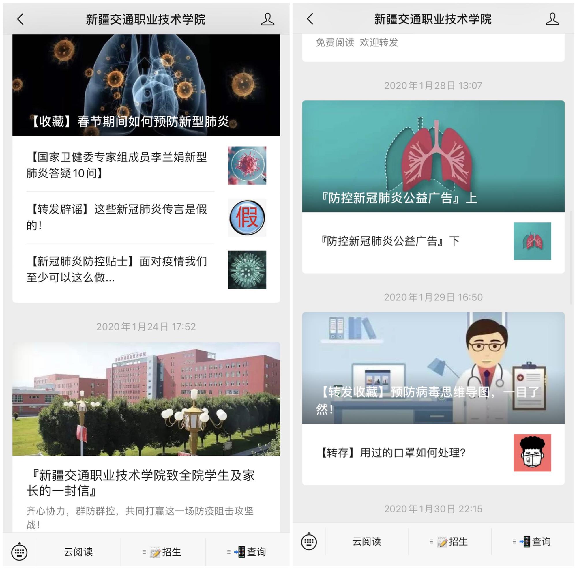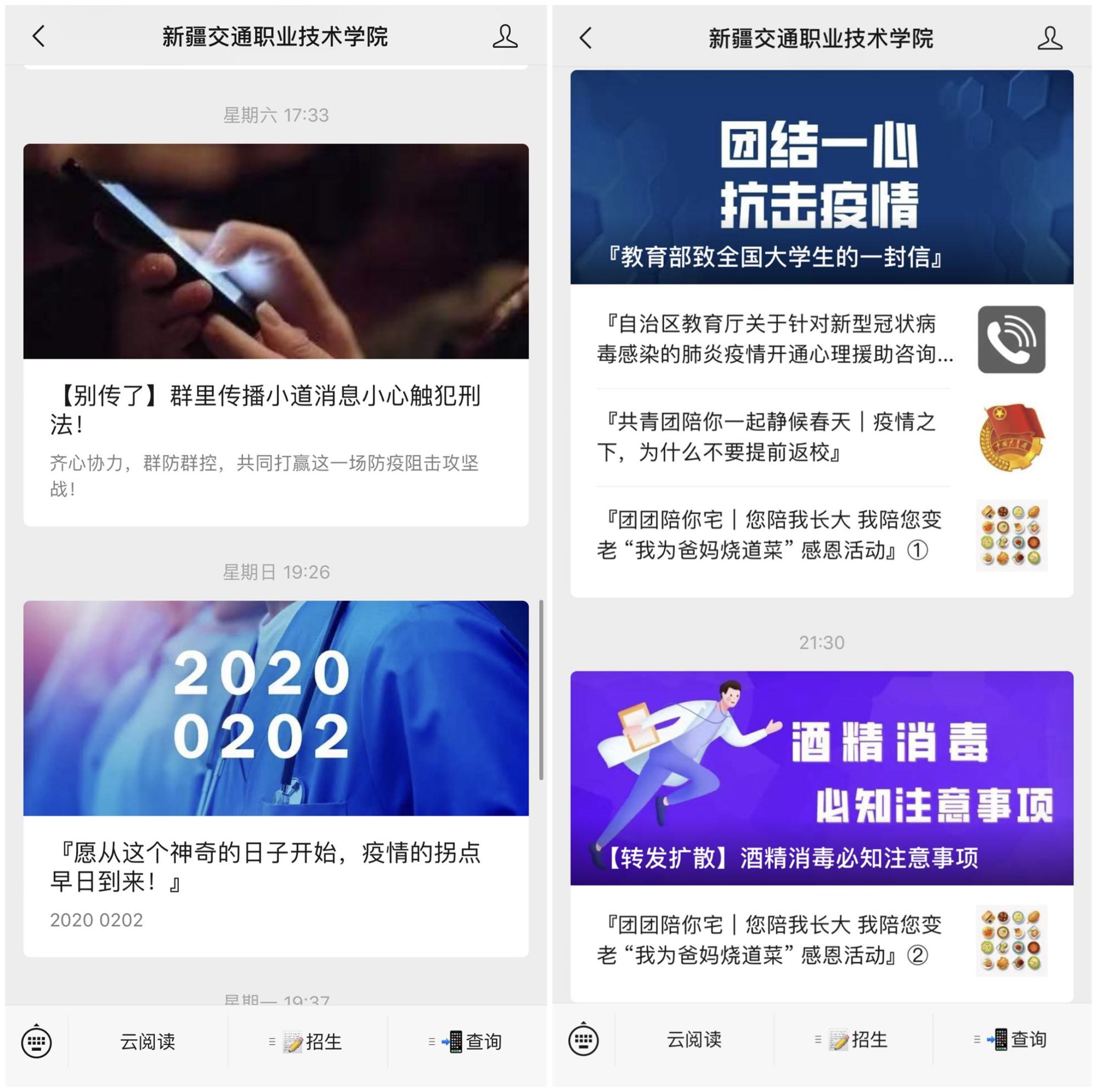 宣传教育,第二层屏障确保疫情防控知识深入人心。学院利用微信公众平台、微信群、QQ群、致学生及家长的一封信等方式,以图文、动态图、短片等生动的方式向师生宣传普及疫情防治知识和防控要求。学院官方微信平台团队的师生收到疫情防控知识宣传工作任务后,分工合作,各自在家完成各项工作,他们搜集新华网、人民日报等权威网站的信息,并结合学院实际做好宣传引导工作,为进一步做好权威发声、合力抗疫的各项工作,向全院师生发出不造谣、不信谣、不传谣的倡议,学院师生以实际行动配合防疫工作,齐心协力共同打赢疫情防控攻坚战。