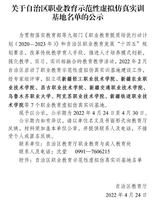 近日,自治区教育厅发布《关于自治区职业教育示范性虚拟仿真实训基地名单的公示》,其中我院申报的智能新能源汽车虚拟仿真实训基地成功的立项为自治区职业教育示范性虚拟仿真基地。