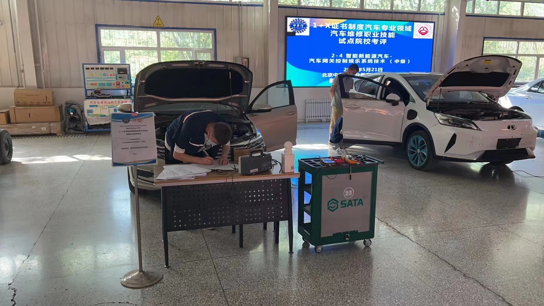 本次考评分两批,第一批5月16日-21日,新能源汽车运用与维修技术专业20级40人参加智能新能源汽车-新能源汽车网关控制娱乐系统技术中级证书认证考评;第二批5月23日-5月29日,汽车运用与维修技术专业的80名学生和汽车电子技术专业的40名参加汽车电子电气与空调舒适系统技术中级认证考评。考评内容为按照第三方评价组织的考评要求,分4个项目,每个项目2个工位,每位考生的考试时间共为120分钟。