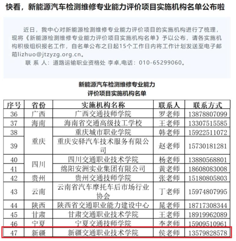 近日,交通运输部职业资格中心(职业技能鉴定指导中心)公布了《新能源检测维修专业能力评价项目实施机构名单》,我院成功入选。本次全国共47家单位入选,我院作为新疆唯一入选的一家单位。