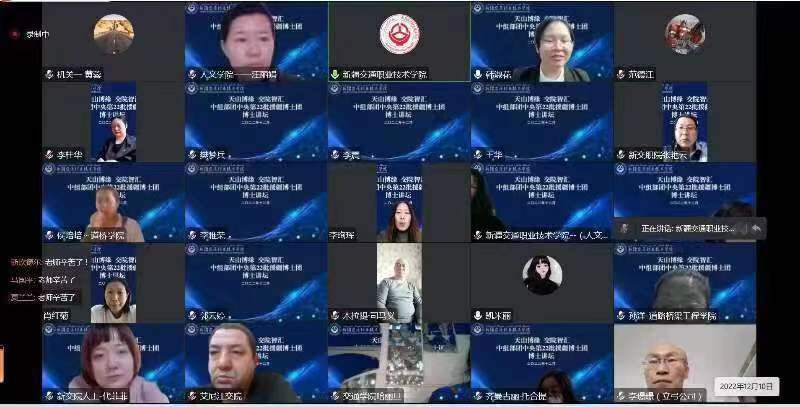 为深入贯彻落实党的二十大报告关于“坚持为党育人、为国育才,全面提高人才自主培养质量”要求,切实增强学院学术氛围,拓展科学研究视野,激发师生学术研究活力,学院与第22批援疆博士团共同组织开展“天山博缘,交院智汇”博士讲坛活动。此次讲坛自12月10日启动,1月15日结束,涉及电子商务、物流管理、国际关系、文化建设、媒体融合、传染病防治、课程设计等领域共13场讲座,是一次难得的精神盛宴,活动一经宣传在学院师生中引起了强烈的反响。