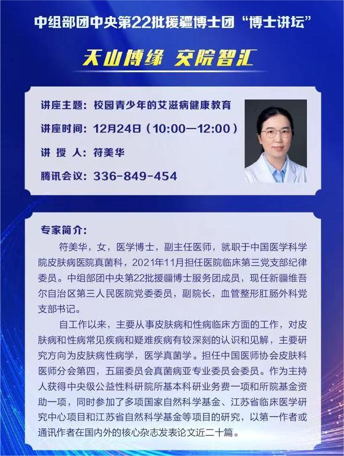主讲嘉宾符美华博士就职于中国医学科学院皮肤病医院真菌科,担任医院临床第三党支部纪律委员,中组部团中央第22批援疆博士服务团成员,现任新疆维吾尔自治区第三人民医院党委委员、副院长。对皮肤病、性病常见疾病及疑难疾病有较深刻的认识和见解,临床经验丰富、科研成果丰富。