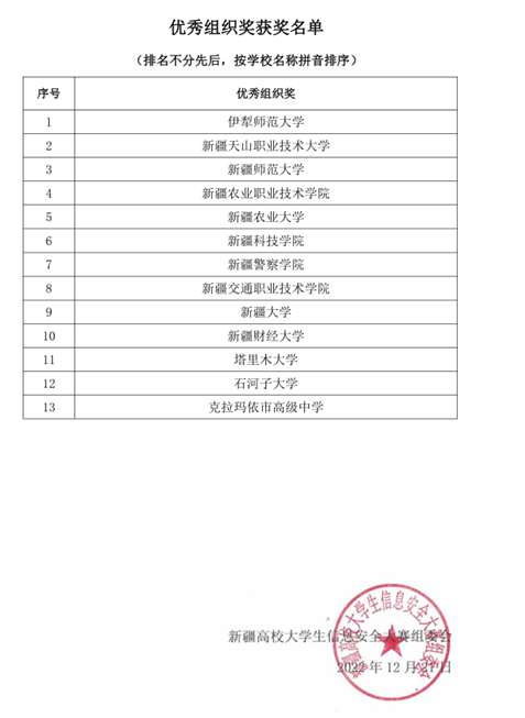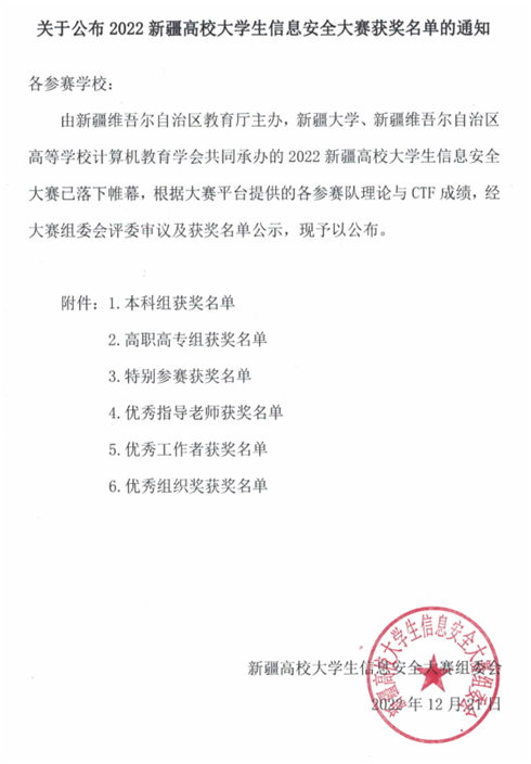 12月11日,2022新疆高校大学生信息安全大赛圆满落幕,本次大赛由新疆维吾尔自治区教育厅主办,新疆大学、新疆维吾尔自治区高等学校计算机教育学会共同承办,全疆15所学校198支参赛队共589人参赛。