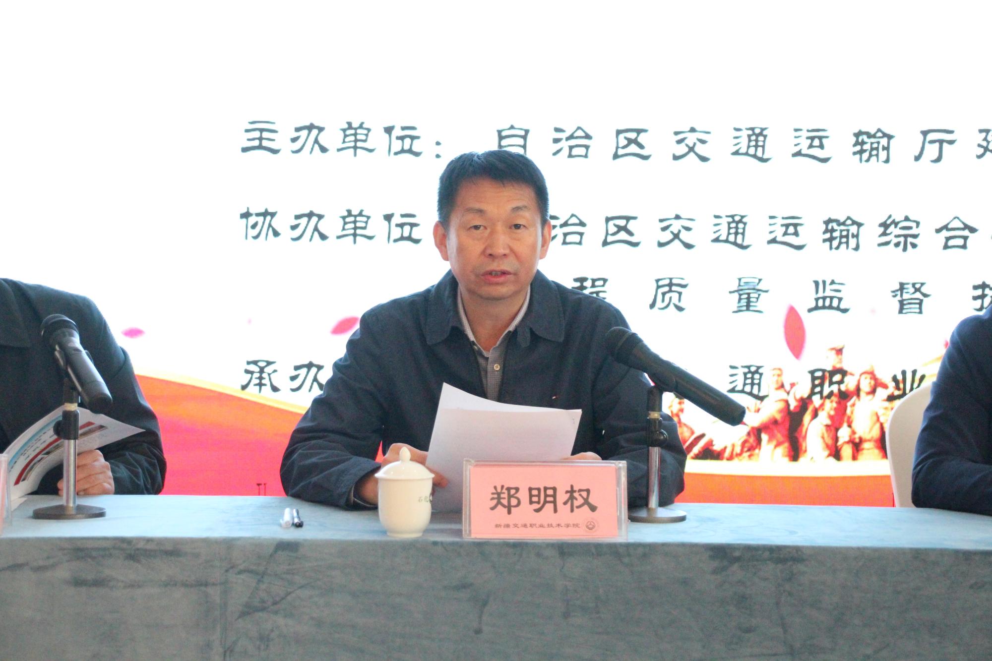 自治区交通运输厅副厅长级干部郑明权出席开班仪式并讲话,新疆交通职业技术学院党委书记王瀚致词,自治区交通运输厅建设管理处处长孙宪魁主持开班仪式,自治区交通运输综合行政执法局工程质量监督执法支队党委副书记,支队长程玉林出席仪式。