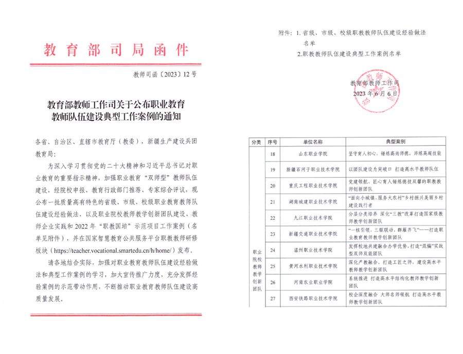 近日,教育部教师工作司下发《关于公布职业教育教师队伍建设典型工作案例的通知》,现代物流管理专业国家级职业教育教师教学创新团队报送的案例《“一核引领,三驱联动,群燕齐飞”——打造职业教育教师教学创新团队》成功入选教育部职教教师教学创新团队典型工作案例。该案例是我院运输管理学院落实职业教育提质培优行动计划,不断深化高水平双师队伍建设工作取得的又一标志性成果。