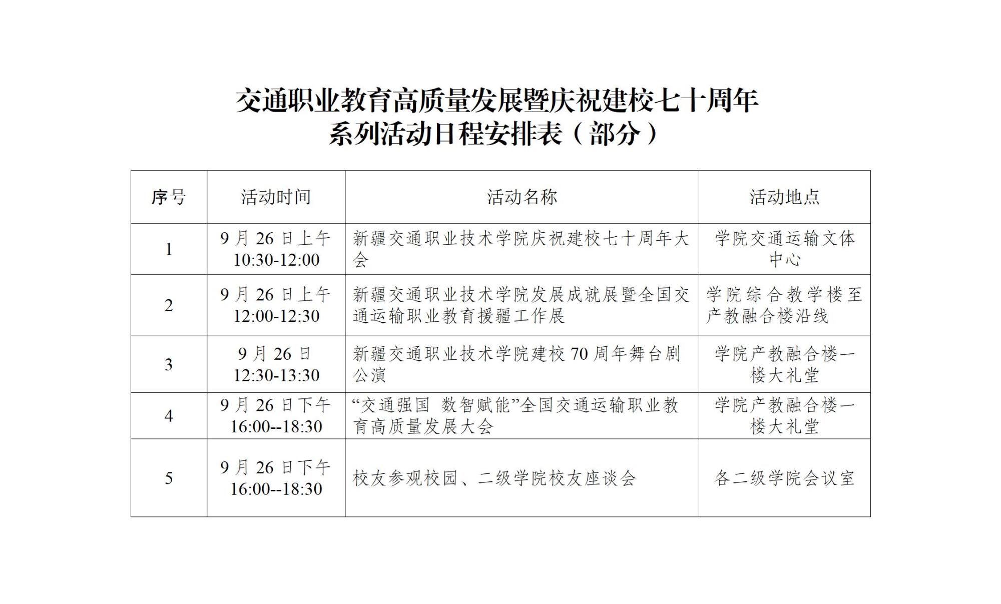 佳期如约至,盛会众事举。70周年校庆是海内外全体新疆交职院人抚今追昔、畅叙友情的一次盛会,新疆交通职业技术学院热切期盼、热忱欢迎广大校友和各界友人届时拨冗莅临,相约新疆交通职业技术学院共叙深情厚谊、同绘美丽蓝图!