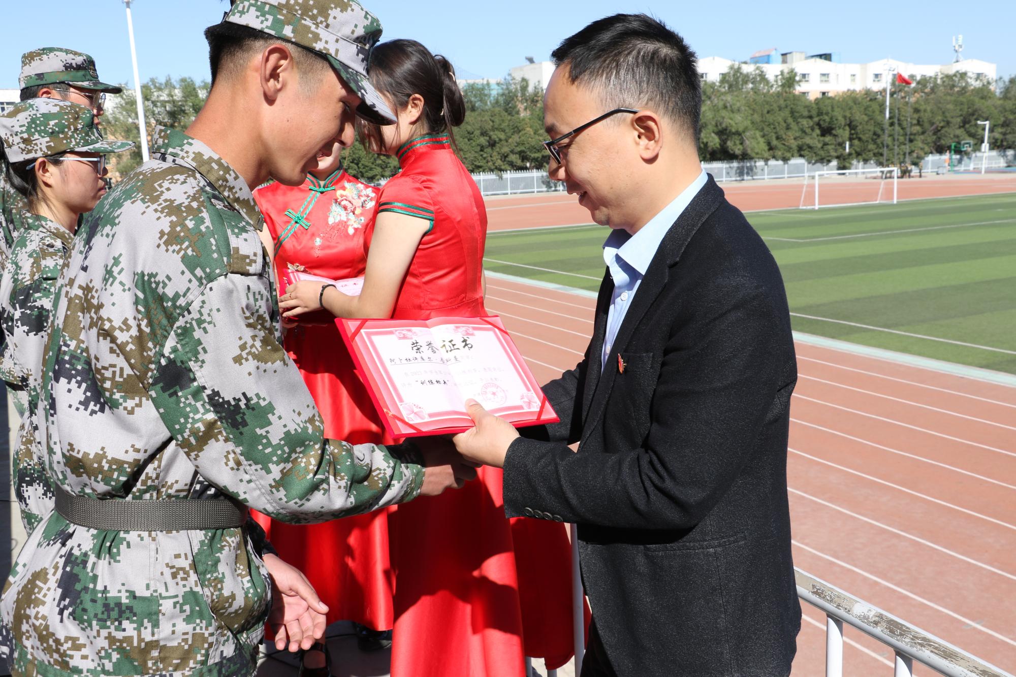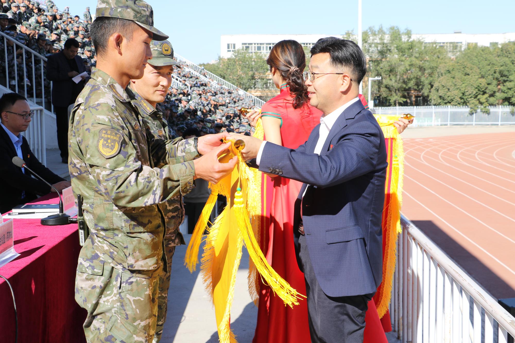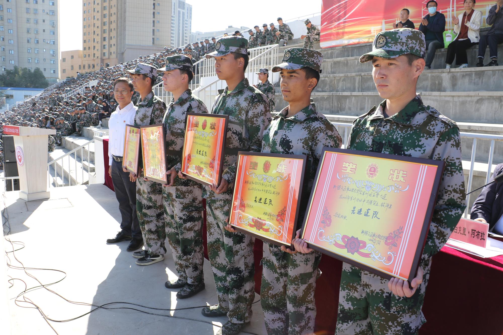 大会表彰了军训先进集体和先进个人;何朴代表学院全体师生向武警新疆总队某部赠送锦旗,向军训先进集体、优秀教官颁发奖状及荣誉证书,为此次军训武警新疆总队教官和各位带队老师致以崇高的敬意和衷心的感谢。