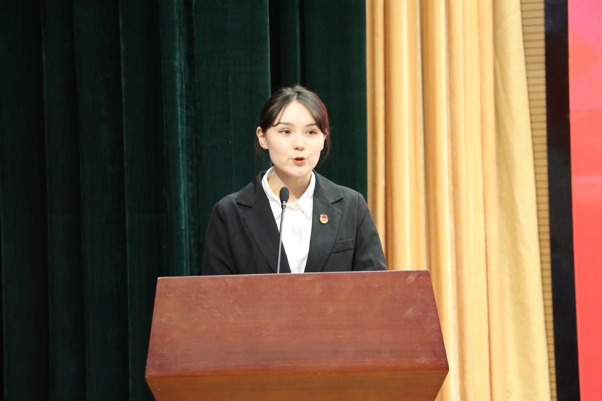阿娅拉·吉盖同学作为学员代表发言,她表示:我们一个个“小青马”要在今后的学习生活和工作中充分发挥自身的先锋模范和示范辐射作用,积极引领带动广大青年关心关注党和国家的发展变化,利用自己的知识、发挥自己的水平、创造自己的价值,担当时代使命,让青春在全面建设社会主义现代化国家的火热实践中绽放绚丽之花。