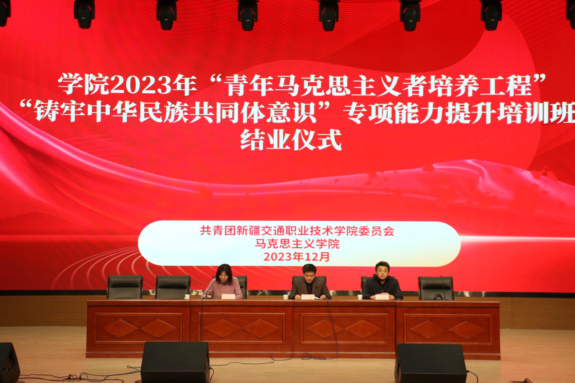 12月14日,学院2023年“青年马克思主义者培养工程”“铸牢中华民族共同体意识”专项能力提升培训班结业仪式在交院大礼堂举行,学院党委书记王瀚出席结业仪式。结业仪式由团委副书记张翾子主持。