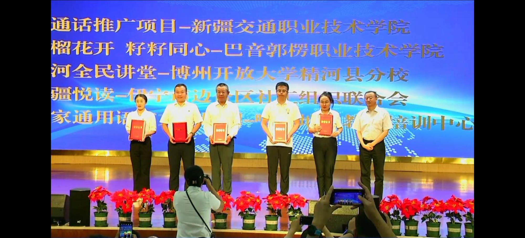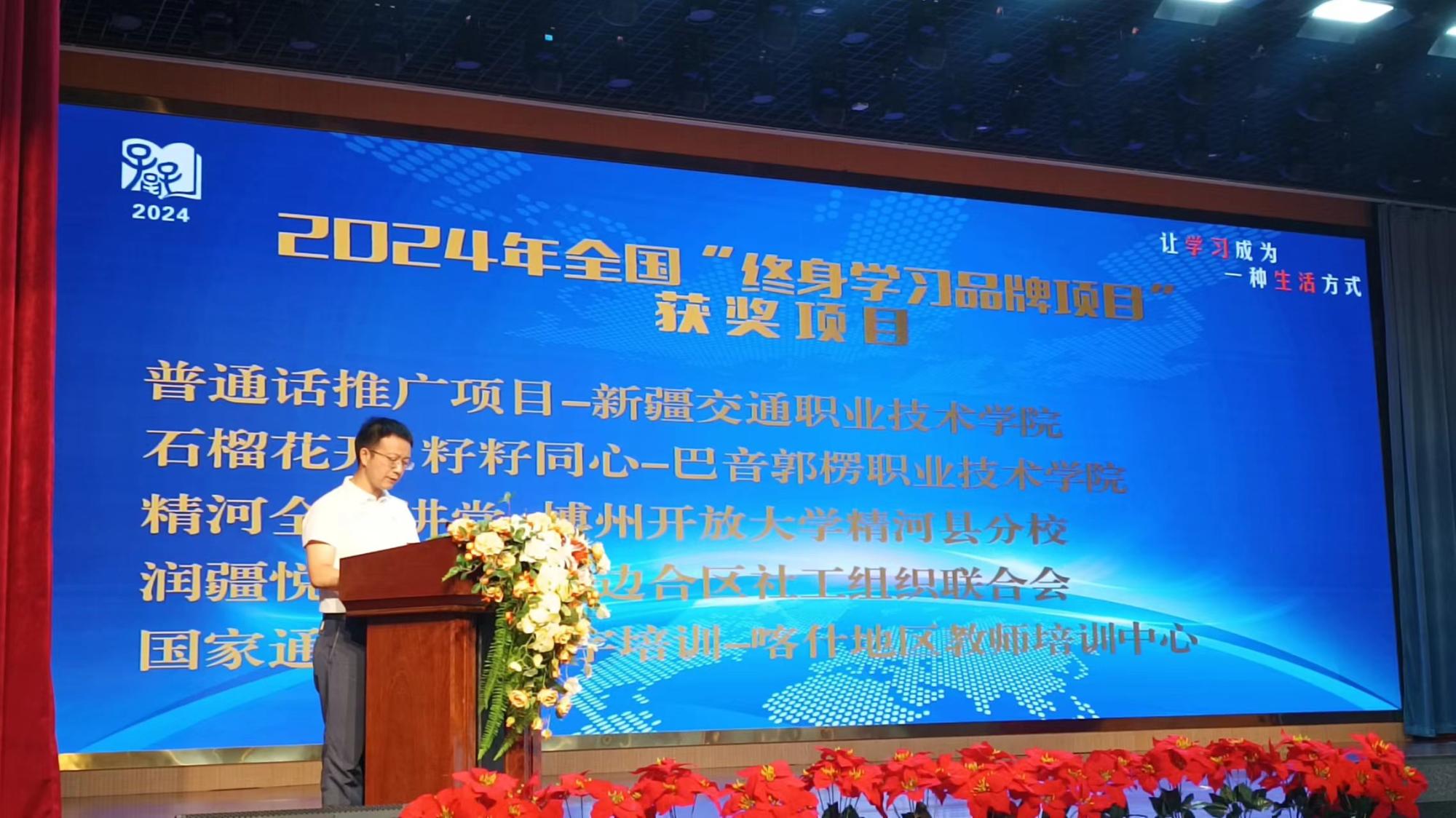 7月15日,以“让学习成为一种生活方式”为主题的自治区2024年全民终身学习活动周开幕式在博乐开放大学举行,开幕式由自治区教育厅主办。我院“普通话推广”终身学习品牌项目荣获全国终身品牌项目并在开幕式上参与展播,人文基础教育学院党总支书记叶来·叶尔扎提作为获奖项目负责人在开幕式上领奖并应邀作交流发言。