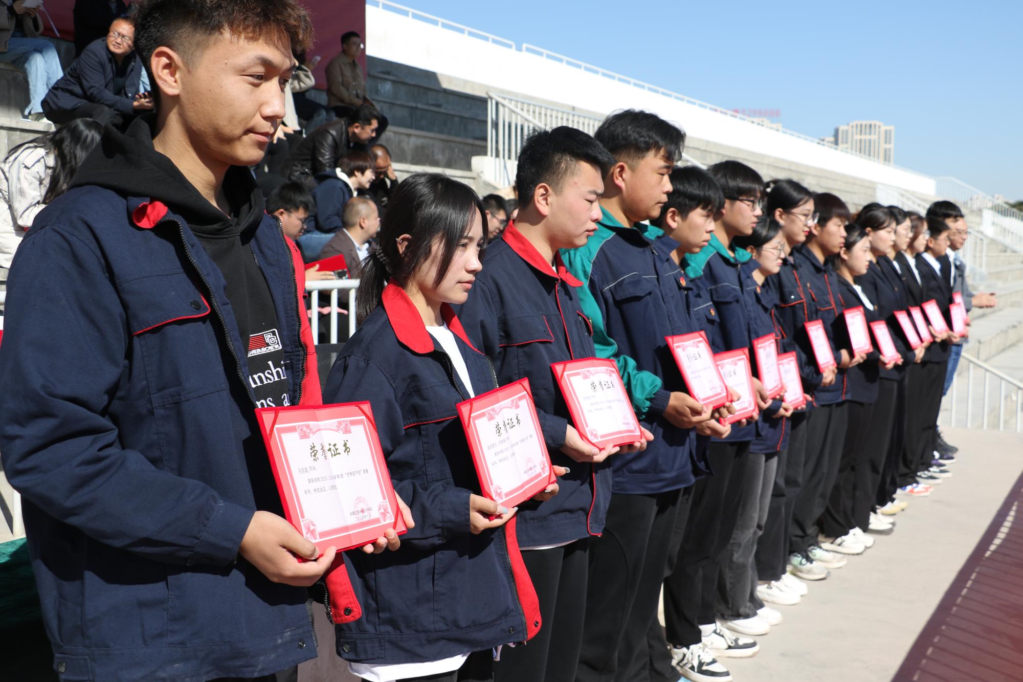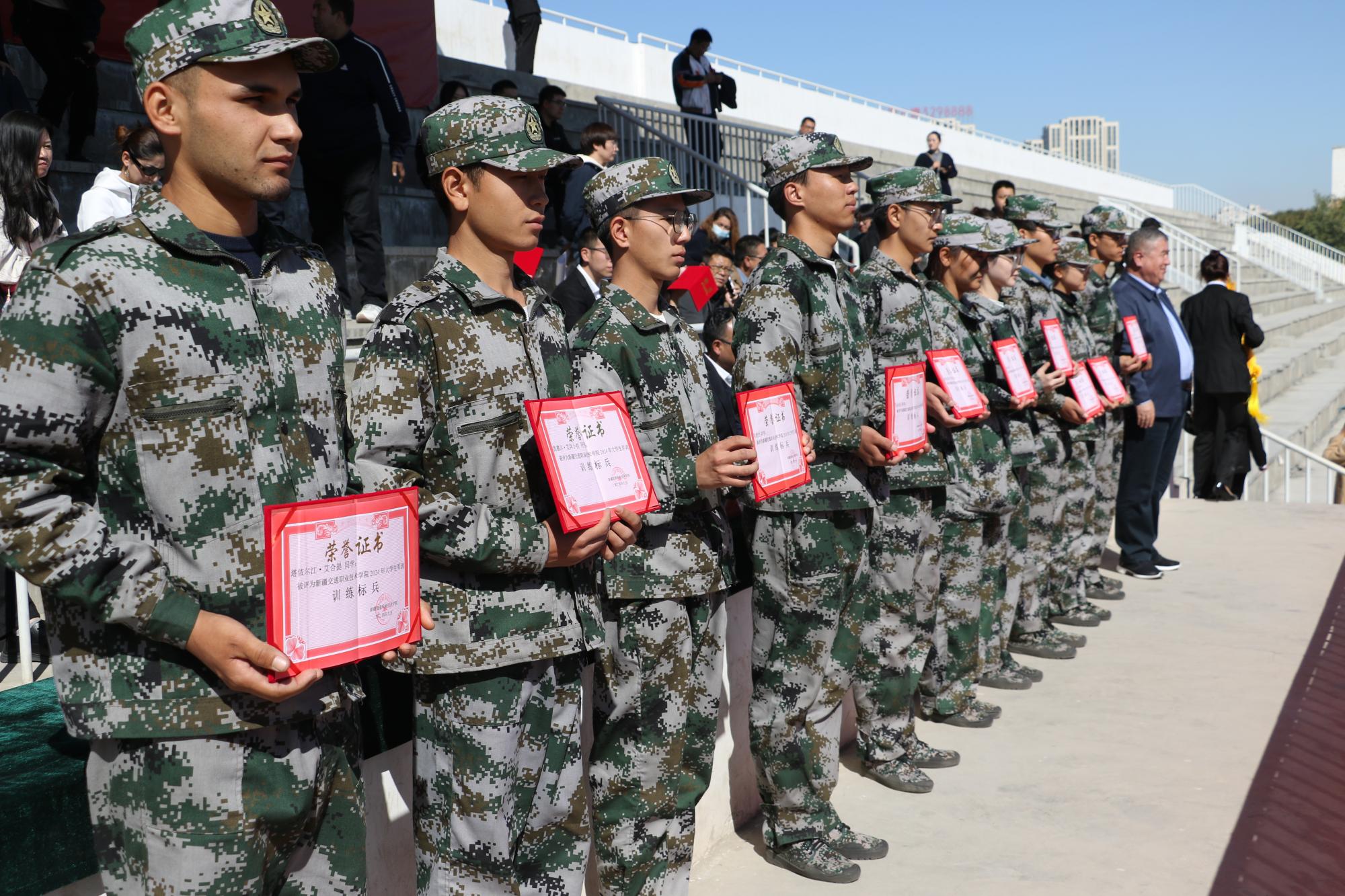 在总结会上,学院向武警新疆总队乌鲁木齐支队赠送了锦旗,并向军训优秀营、优秀连队、优秀教官代表、优秀标兵颁发荣誉证书。同时,学院为新聘任政治辅导员颁发聘书,并表彰了2023-2024学年“三好学生”“优秀班干部”。