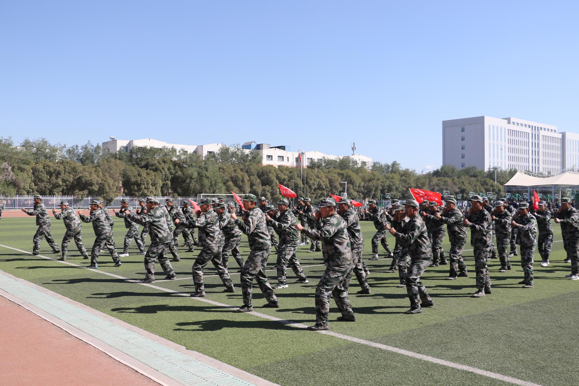 军训汇报表演环节,同学们个个精神抖擞,目光如炬,整齐的步伐、嘹亮的口号、严整的军姿,展示出了新生积极进取、昂扬向上的精神风貌。此外军训标兵连队还进行了刺杀操、匕首操、擒敌拳等军事技能项目展示,一招一式尽显军人本色和青春锐气,赢得了在场师生的阵阵掌声。