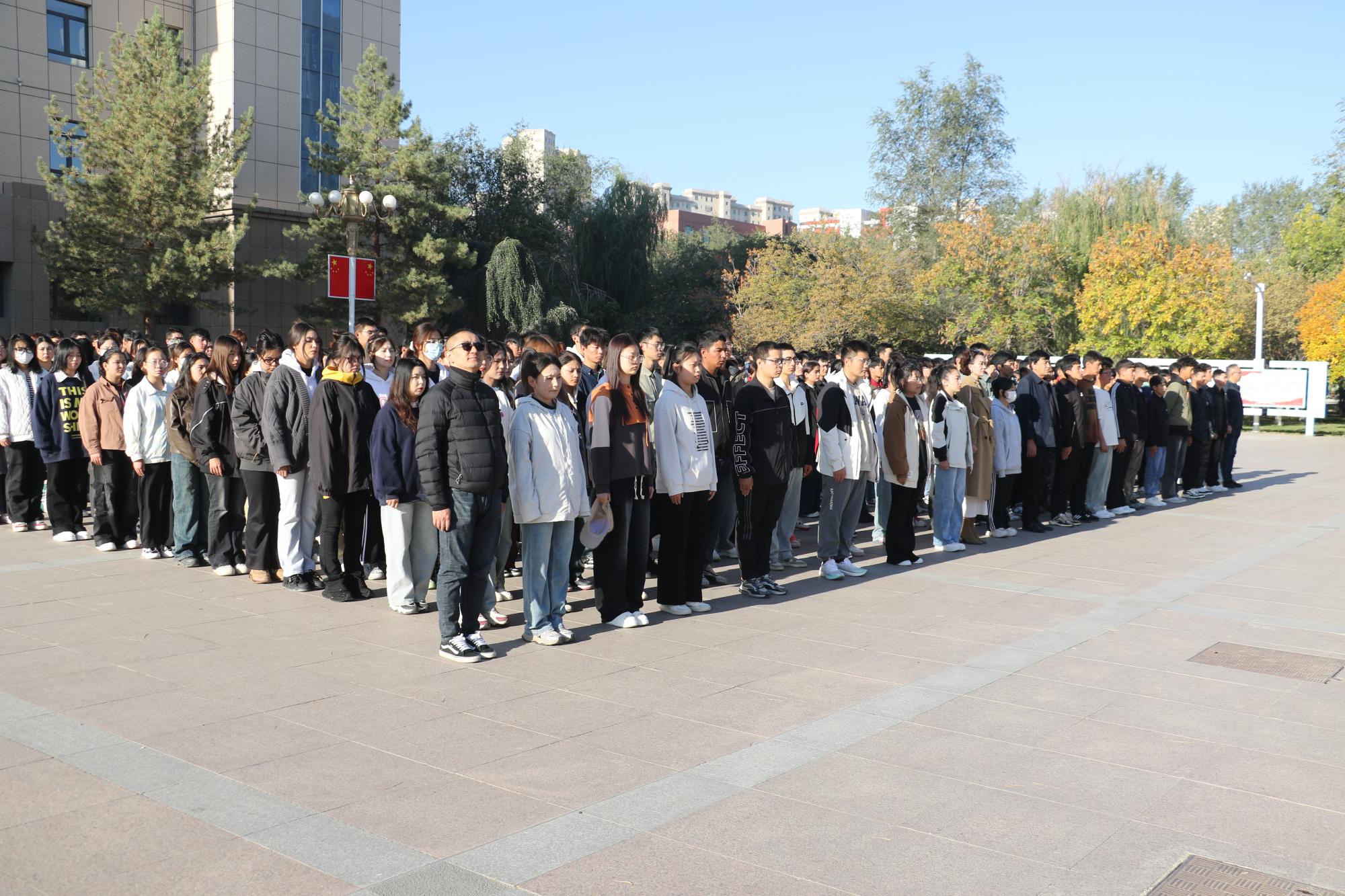 秋高气爽、风和日丽,中华人民共和国迎来75周年华诞,学院内红旗飘扬、鲜花盛开,隆重的升国旗仪式在图书馆前广场举行,各族师生汇聚在此,怀着激动的心情,共同期待庄严时刻的到来。