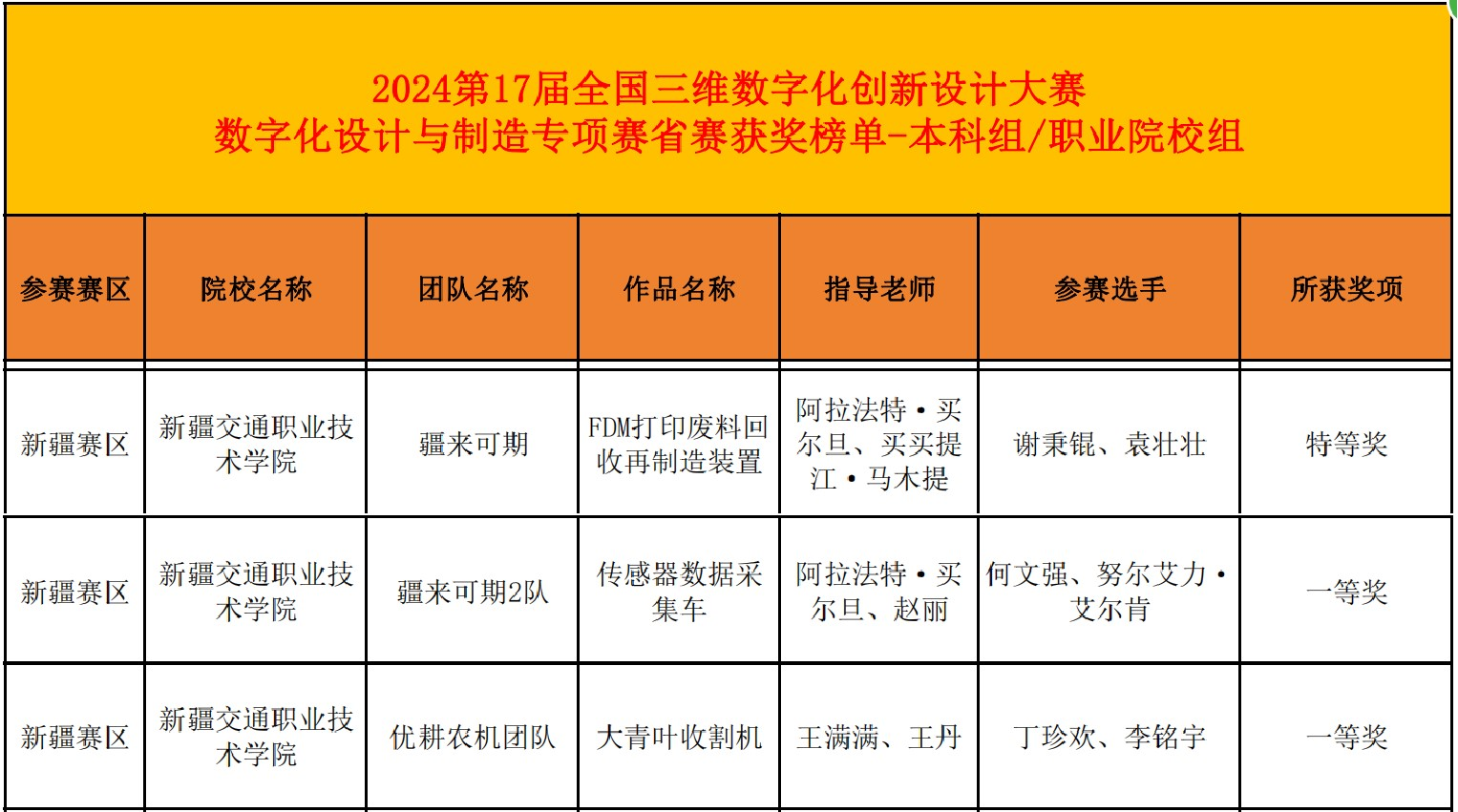 经过激烈角逐,我院参赛师生从众多参赛团队中脱颖而出,由阿拉法特·买尔旦、买买提江·马木提指导,谢秉锟、袁壮壮设计的《FDM打印废料回收再制造装置》荣获省级特等奖,并成功入围国赛;由阿拉法特·买尔旦、赵丽指导,何文强、努尔艾力·艾尔肯设计的《传感器数据采集车》荣获省级一等奖;由王满满、王丹指导,丁珍欢、李铭宇设计的《大青叶收割机》荣获省级一等奖。