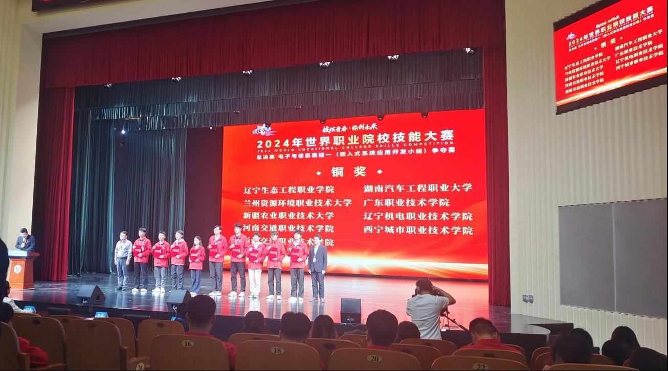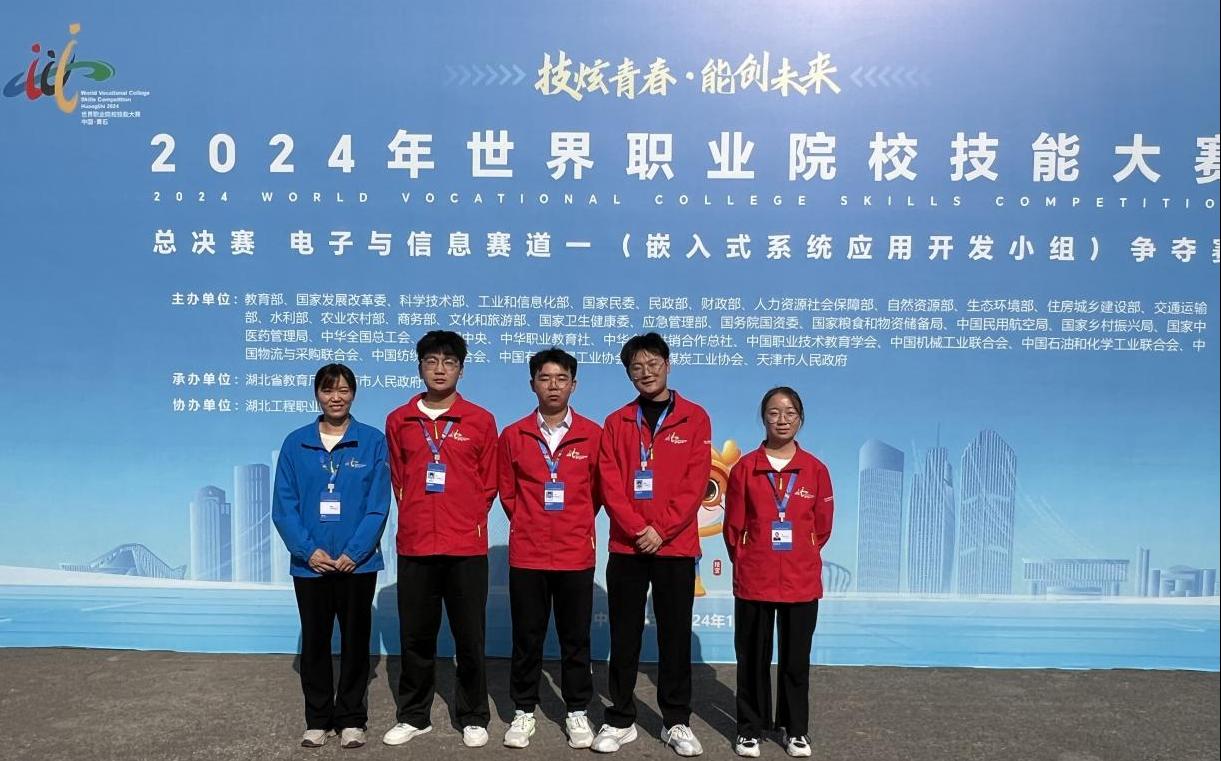 近日,备受瞩目的2024年世界职业院校技能大赛总决赛(争夺赛)电子与信息赛道一(嵌入式系统应用开发小组)在湖北工程职业技术学院圆满落下帷幕。本次大赛吸引了全国32个省区市的61所职业院校参加。学院时凯、刘泽宇、原锌铭、严莹四名同学组队代表自治区参赛,经过紧张激烈的角逐,最终我院参赛队凭借扎实的专业知识、出色的实践能力和团队协作精神,喜获铜奖。