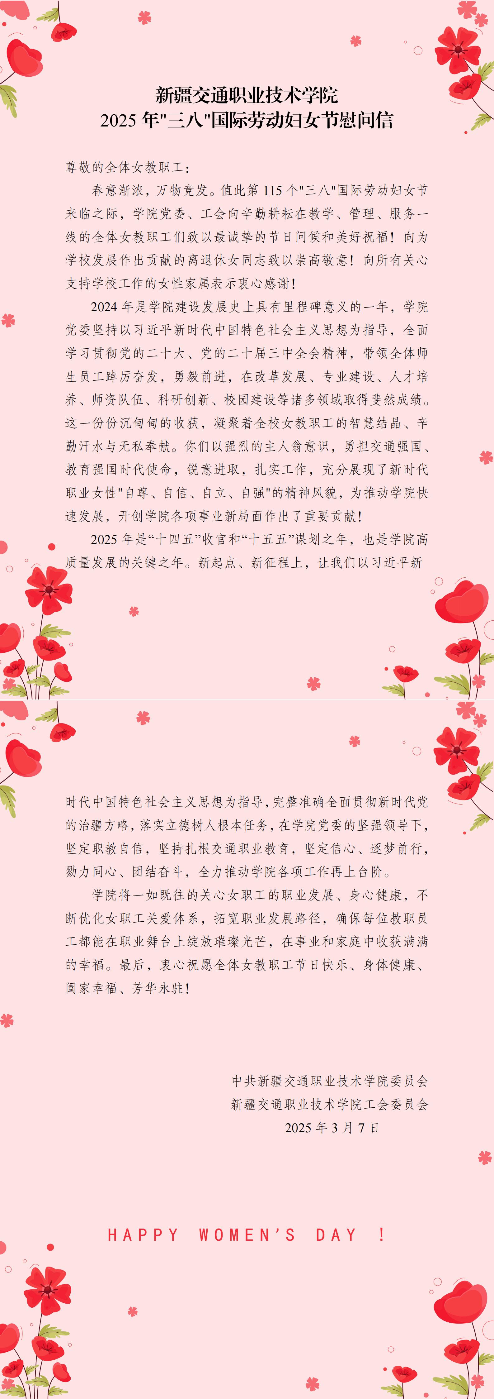 新疆交通职业技术学院 2025年"三八"国际劳动妇女节慰问信