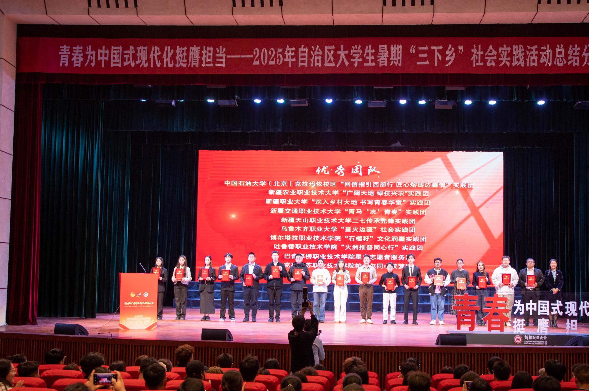 10月29日,“青春中国式现代化挺膺担当”2025年自治区大学生暑期“三下乡”社会实践活动总结分享会在新疆财经大学举办。由校团委指导的青马“志”青春实践团荣获2025年自治区大学生暑期“三下乡”社会实践活动“优秀团队”。