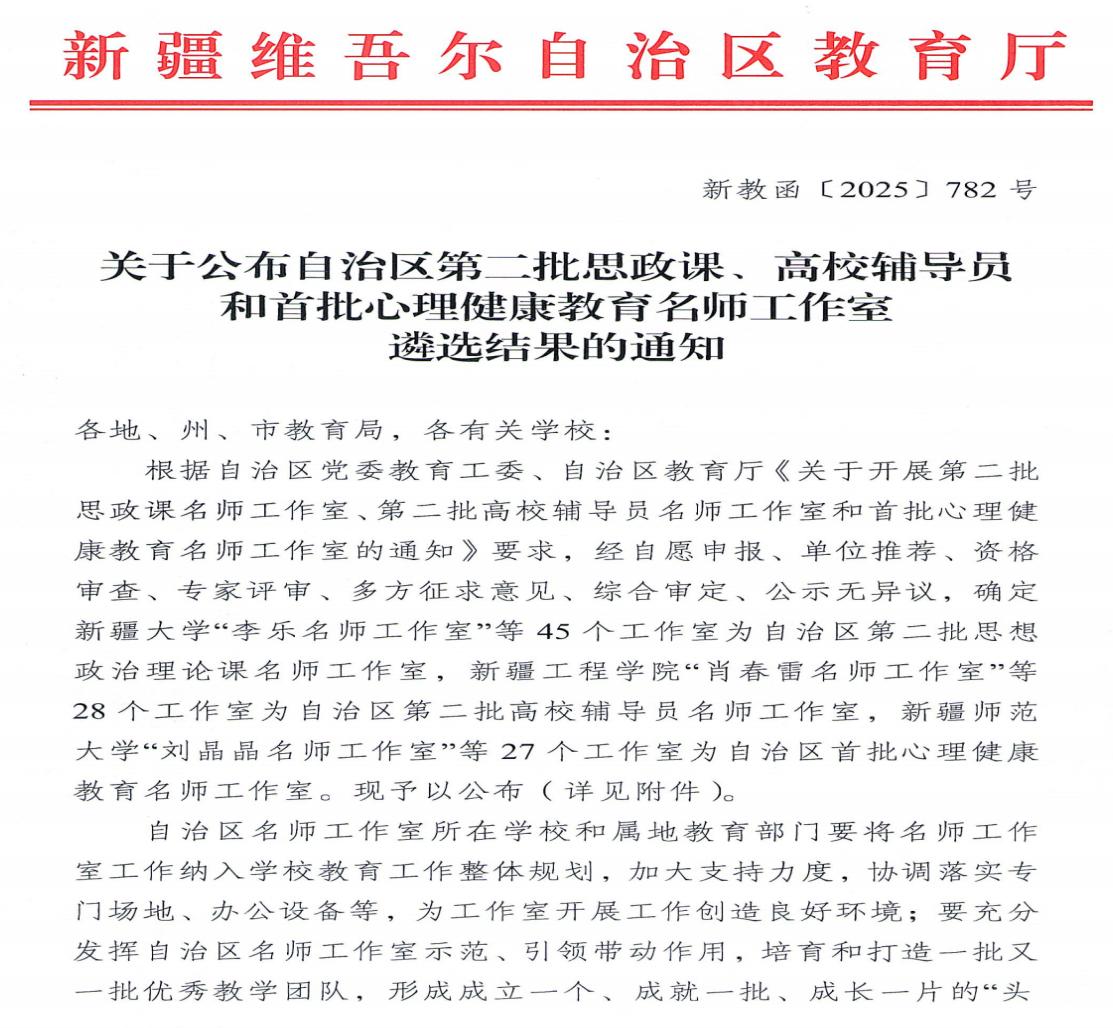 近日,经自治区党委教育工委、自治区教育厅严格评审与正式认定,学校申报的“ICTS智慧思政工作室”成功获批自治区第二批高校辅导员名师工作室。