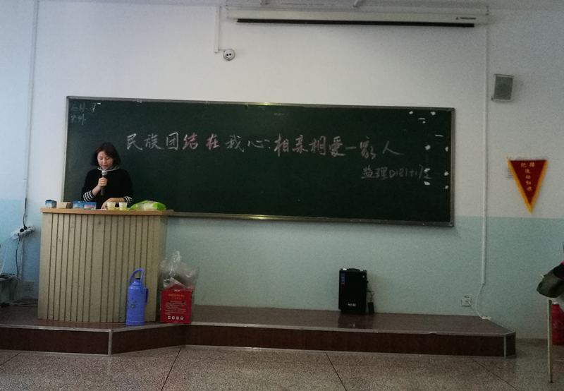 活动开始,由凯迪日耶·买买提艾力同学发生亮剑,她激动地说:“作为中国公民,我们有责任和义务去维护我们祖国的和平稳定,作为大学生,我们更应该树立正确的国家观、民族观、宗教观、历史观和文化观,做到不信谣、不传谣,坚定自己的政治立场,切实做到维护祖国统一和民族团结。”之后,大家一同观看了本班同学带来的歌曲、舞蹈和书法表演;“瞎子指路”小游戏将此次活动推向了高潮,一名学生蒙着双眼在同伴的指引下越过障碍物顺利抵达目的地,不同民族学生团结协作,相互信任,一同收获了胜利的喜悦。最后,班主任李敏老师发言:我们班是一个多民族的大家庭,希望各民族同学们之间能够团结友爱、互相帮助、共同进步,因为我们是相亲相爱的一家人。活动最后,全班同学一起合唱《相亲相爱一家人》,在嘹亮的歌声中同学们感受到了家的温暖。