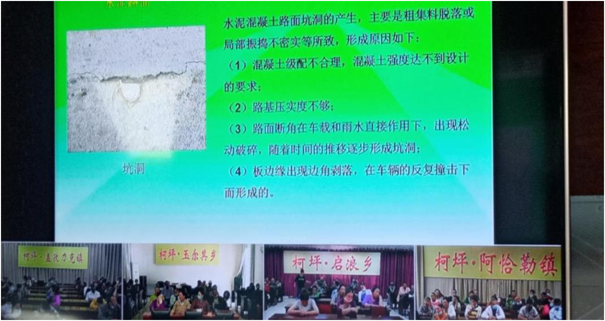 在阿克苏地区柯坪县,热依汗古丽老师与米热汗古丽老师采取了视频教学授课形式生动讲解了农村公路基础知识交通工程及沿线设施养护,课后亲临施工现场,进行具体操作指导,将理论与实践相结合,收获了培训人员及当地领导的好评。维妮拉老师与古力其日老师在喀什地区伽师县培训时,为了让没有专业基础的农民能够听懂、搞明白自己的养路、护路工作职责,采用通俗易懂的语言、深入浅出的一遍遍耐心讲解,让农村公路护路员和路管员进一步掌握了农村公路防灾与突发事件处理时的正确解决办法。课后伽师电视台就培训工作采访了维妮拉老师与古力其日老师。和田地区墨玉县吾尔买江老师与努尔艾合买提江老师运用视频讲座完成了路基、路面、桥涵、交通工程的养护课程的讲解,运用网络平台的强大力量,让更多需要培训的同志加入到了培训学习中。