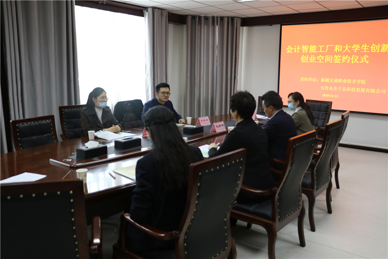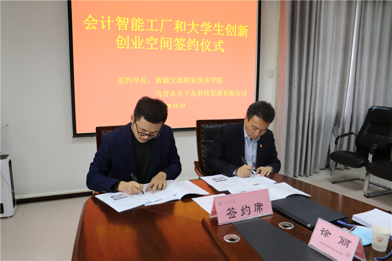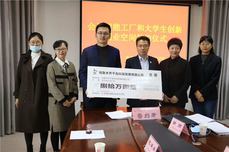 本次合作由运输管理学院牵头,与乌鲁木齐千友科技发展有限公司共同建设会计智能工厂和大学生创新创业空间两个项目,企业预计投入设备80万元,会计智能工厂每年能解决300名财经商贸大类专业学生的实践教学,满足会计专业学生的顶岗实习和就业问题及大学生创新创业空间对学生进行创业培训与指导,帮助学生创新创业,开展就业项目孵化。