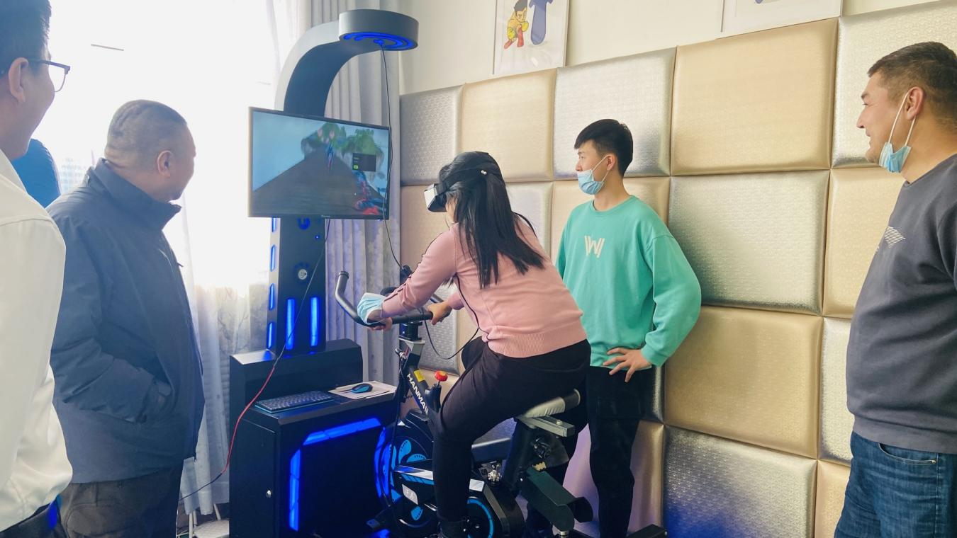 老师们在宣泄室通过VR游戏机放松身体和心情