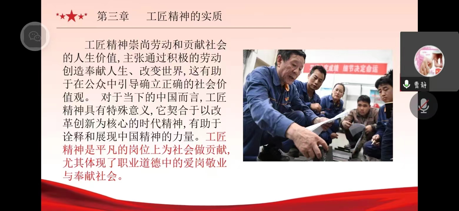 活动伊始,曹静老师组织全体学生认真学习了习近平总书记在中国共产党第二十次全国代表大会上做的题为《高举中国特色社会主义伟大旗帜 为全面建设社会主义现代化国家而团结奋斗》的报告,要求全体学生深入学习,深刻领会,牢记使命,为实现第二个百年奋斗目标,以中国式现代化全面推进中华民族伟大复兴而努力奋斗。接着,曹老师围绕工匠精神的内涵——执着专注,精益求精,一丝不苟,追求卓越展开生动的讲解,以案为例,号召全体积极分子真正感悟工匠精神的真谛,汲取榜样力量,传承工匠精神,践行初心使命。最后曹老师激励全体同学们在党的二十大召开之际,更加坚定的理想信念,从自我做起,脚踏实地,踔厉奋发,勇毅前行,立足专业优势,发扬工匠精神!