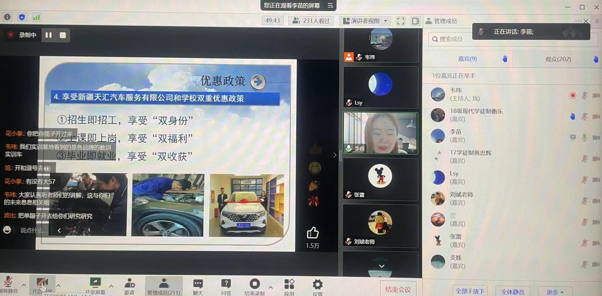 10月26日晚,汽车工程学院学生管理办公室组织学生通过腾讯研讨会开展了第二场汽车检测与维修技术专业介绍。本次活动邀请了专业负责人、毕业生和岗位实习学生为2022级新生答疑解惑,从就业方向、专业发展方向以及个人学业规划等方面开展讲解,此次参会人数达200余人,学生反响热烈。