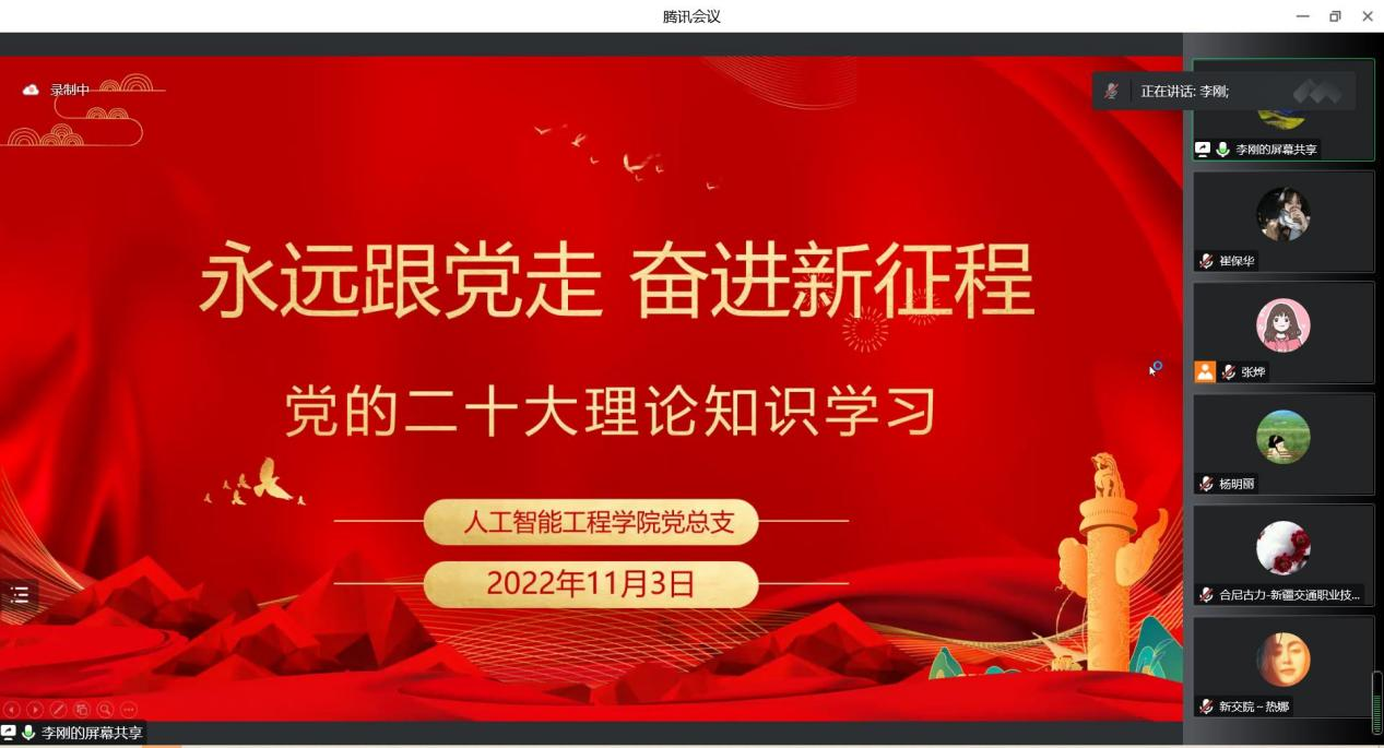 为庆祝党的二十大胜利召开、学深悟透党的二十大精神,进一步深入学习宣传贯彻党的二十大精神,引导分院干部教师以二十大精神为指引,立足教育工作实际,11月3日,人工智能工程党总支组织全体教职工进一步深入学习党的二十大精神。
