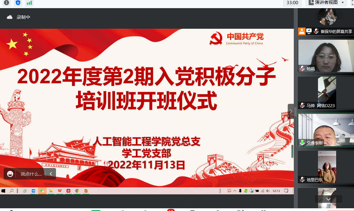 11月13日,人工智能工程学院党总支学工党支部于线上举办了第2期入党积极分子培训班开班仪式。分院党总支书记李刚、网络与信息安全教研室党支部书记王玉洁、学工党支部书记杨娟出席会议。