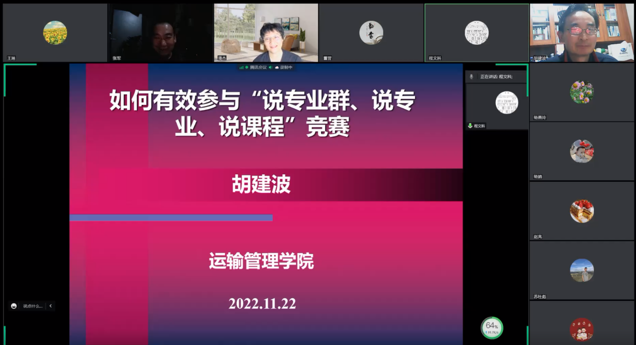 为进一步加强专业建设和课程改革,提升教师教研水平和教学能力,提高人才培养质量,11月22日,运输管理学院邀请了分院副院长胡建波教授在线上开展了“说专业群、说专业、说课程”专题培训会。