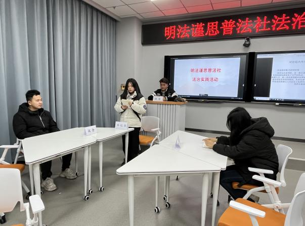 11月28日,马克思学院明法谨思普法社在学院综合楼智慧教室开展“明法悟道”法治实践展示活动。