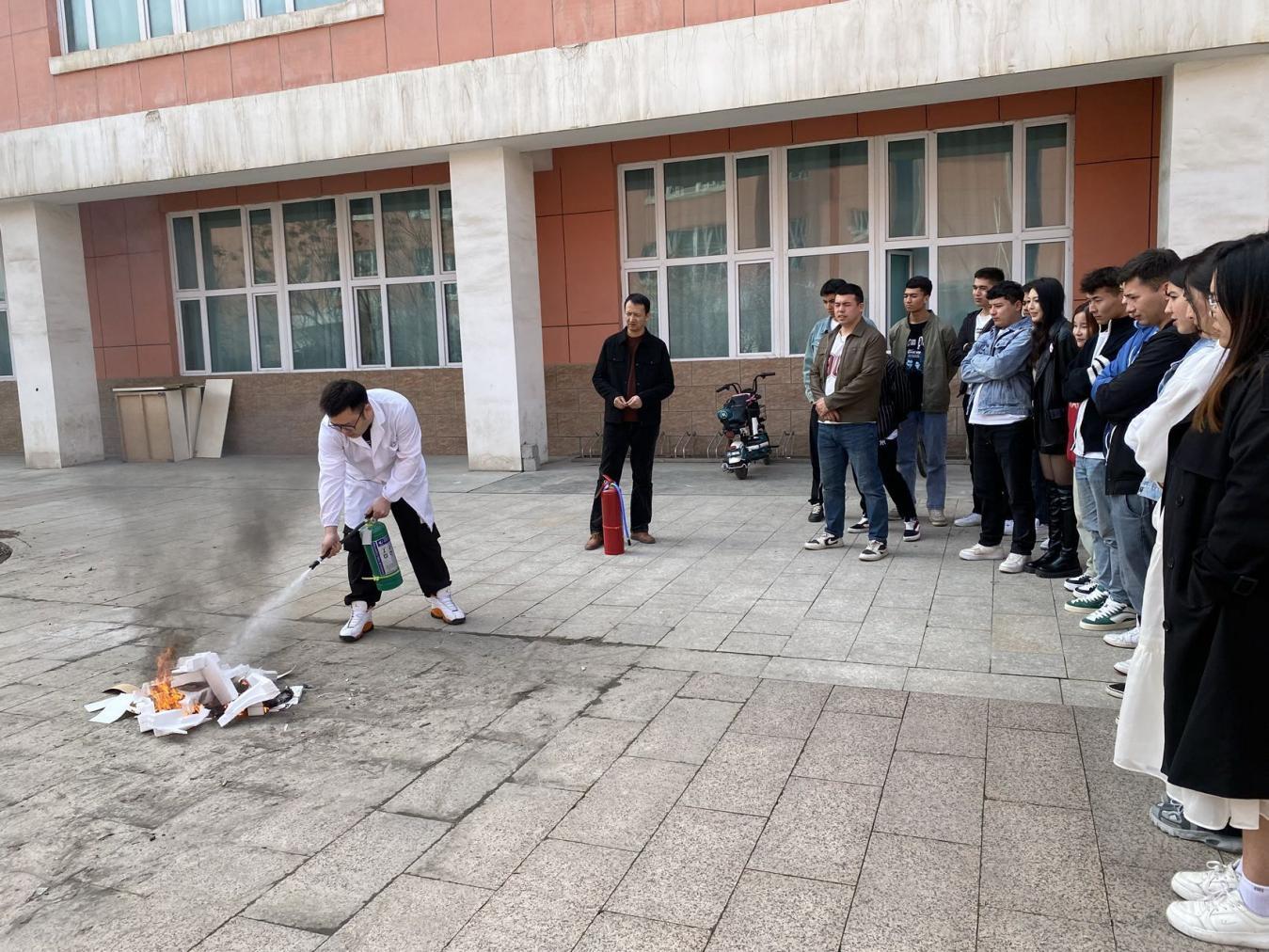 演练结束后,实训中心的老师们讲解了灭火器的用途,并对如何使用水基、干粉灭火器进行现场示范,也让学生们在学习理论知识的同时,亲自“上手”体验“提拔握压”的灭火器操作要领。此外,实训中心管理员老师还通过互动问答方式,加深了同学们对于消防安全知识的理解。
